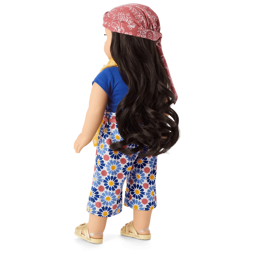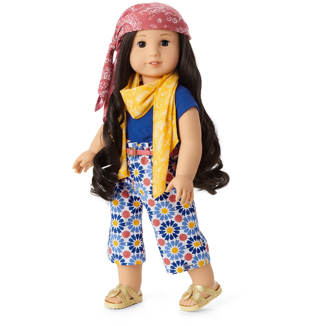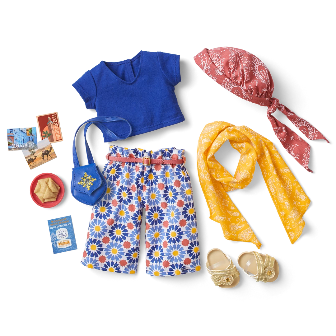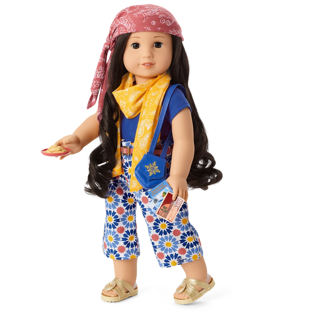 Dolls can explore the northern coast of Africa with a set inspired by colorful tile motifs and the blue of the Mediterranean Sea. Includes: