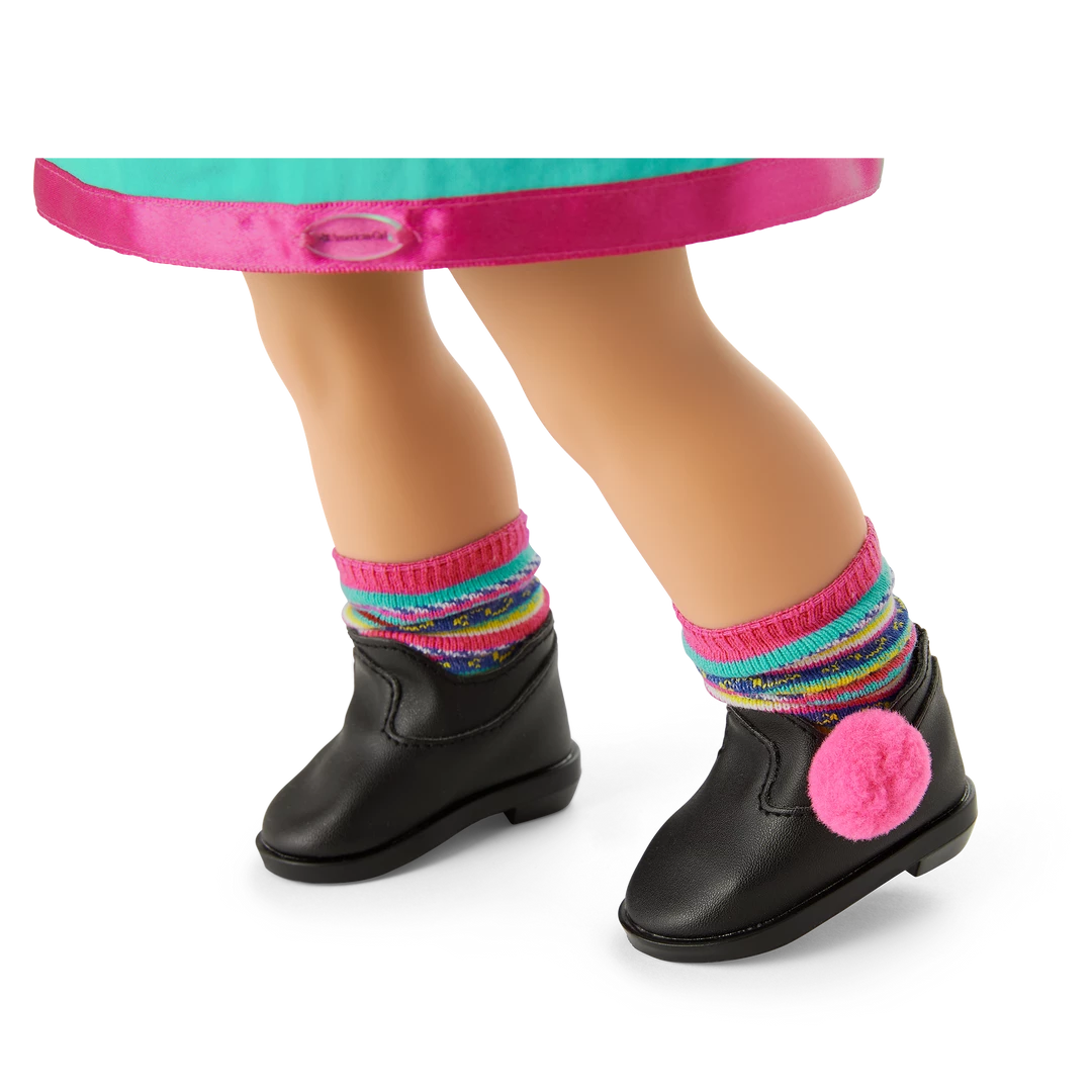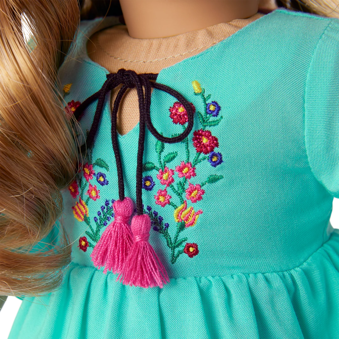 - A turquoise dress with flounce sleeves, floral embroidery at the bodice, ribbons on the hem, and a tasseled tie closure at the neckline