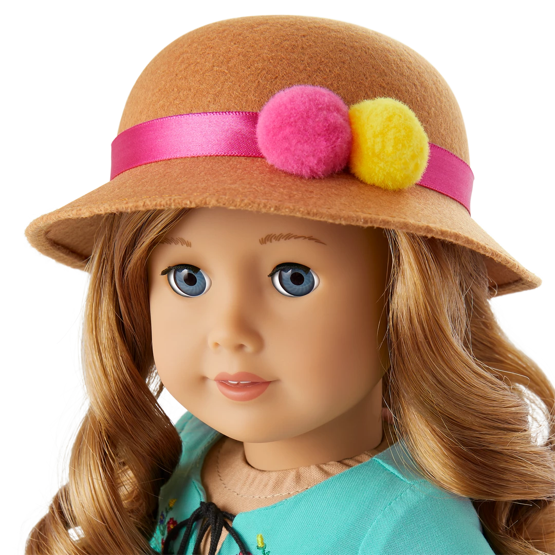 - A felt hat with ribbon trim on the band and two pom-poms on the side