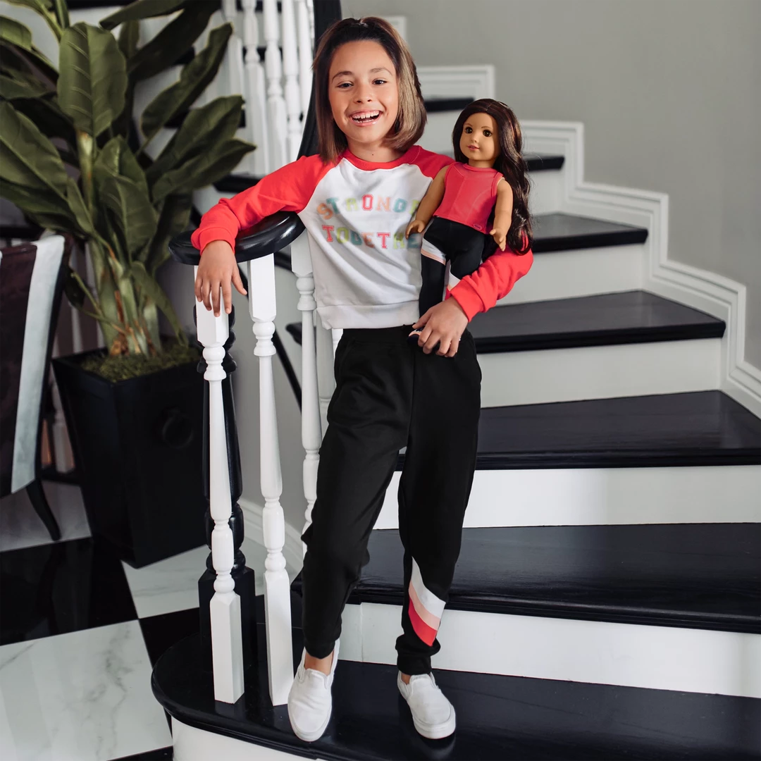 American Girl® x Janie and Jack: Maritza’s™ Black Striped Joggers for Girls: Black French terry jogger sweatpants with diagonal red stripes on the left leg that match the Stronger Together Sweatshirt. Cotton/polyester. Imported. Sizes 6-16