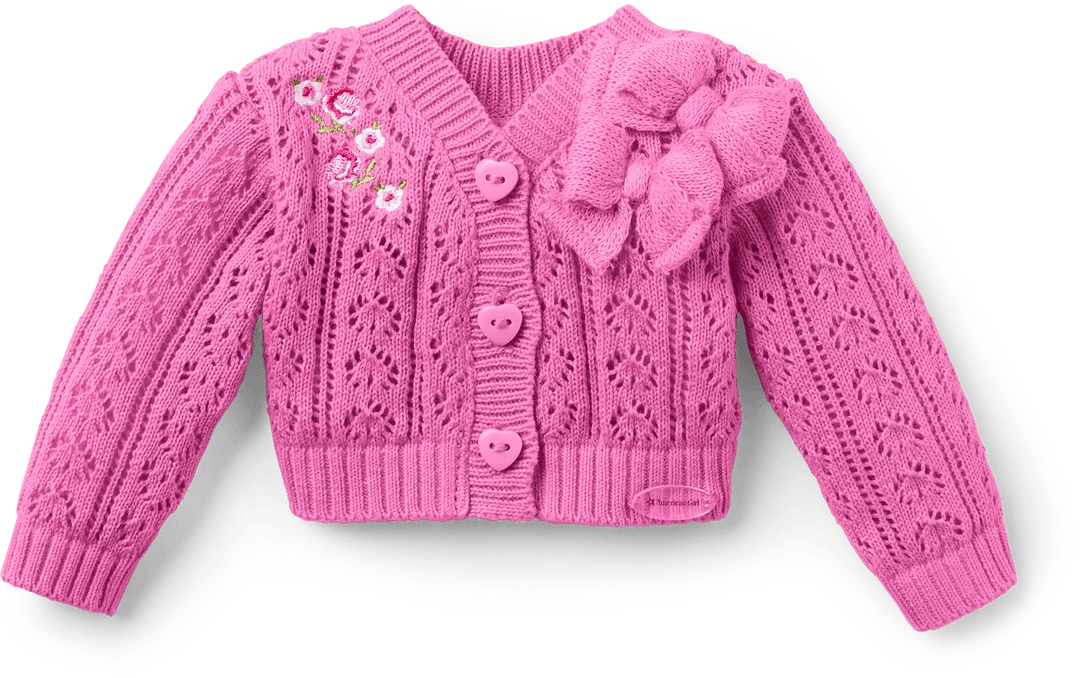 LoveShackFancy Garden Party Cardigan for 18-inch Dolls: A pink pointelle cardigan with a heart knit pattern and heart-shaped buttons
