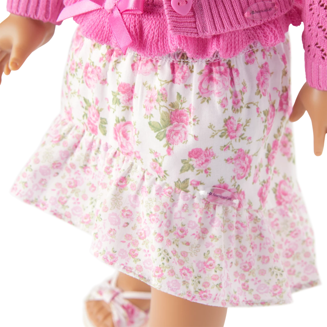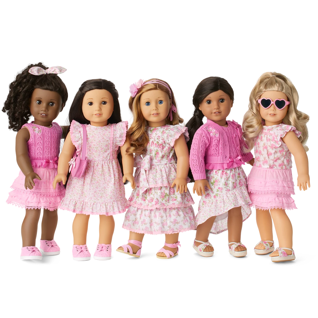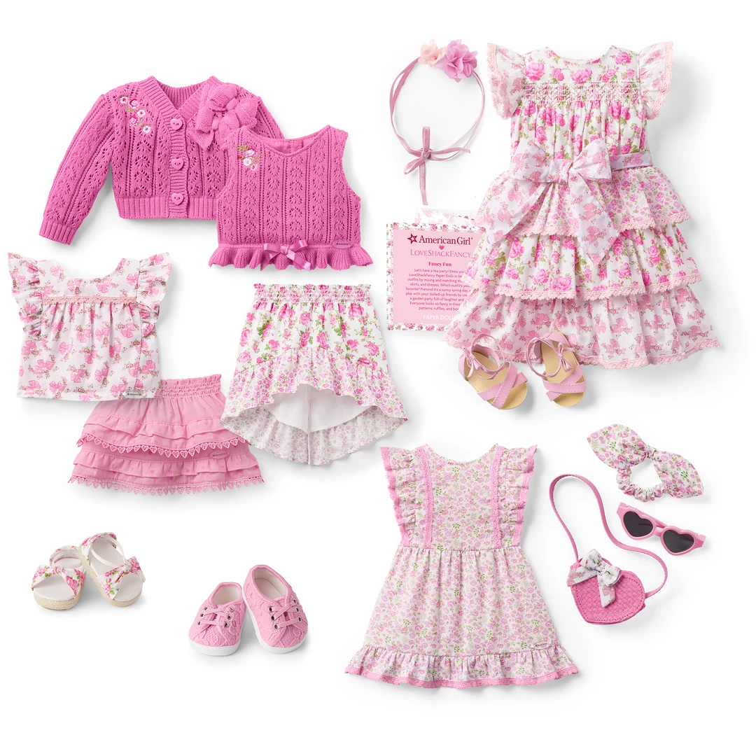 Your girl can dream up the ultimate garden party for her dolls, with fresh florals and pretty pinks to mix and match. This collection, designed in collaboration with LoveShackFancy, features: