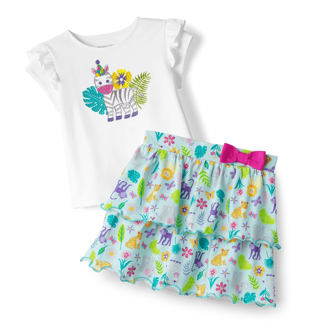 Your little one will love to celebrate her birthday—or Bitty Baby’s!—in this animal-themed outfit. Just like the doll-sized version, the top has a festive zebra in an embroidered party hat graphic, and the short sleeves have ruffles at the shoulders. The layered skort has a fun print with wild animals and flowers, plus a pretty pink bow at the hip and built-in shorts. Top: Cotton/spandex. Imported. Multi. Sizes 3-6. Skort: Cotton/spandex/nylon. Imported. Multi. Sizes 3-6.